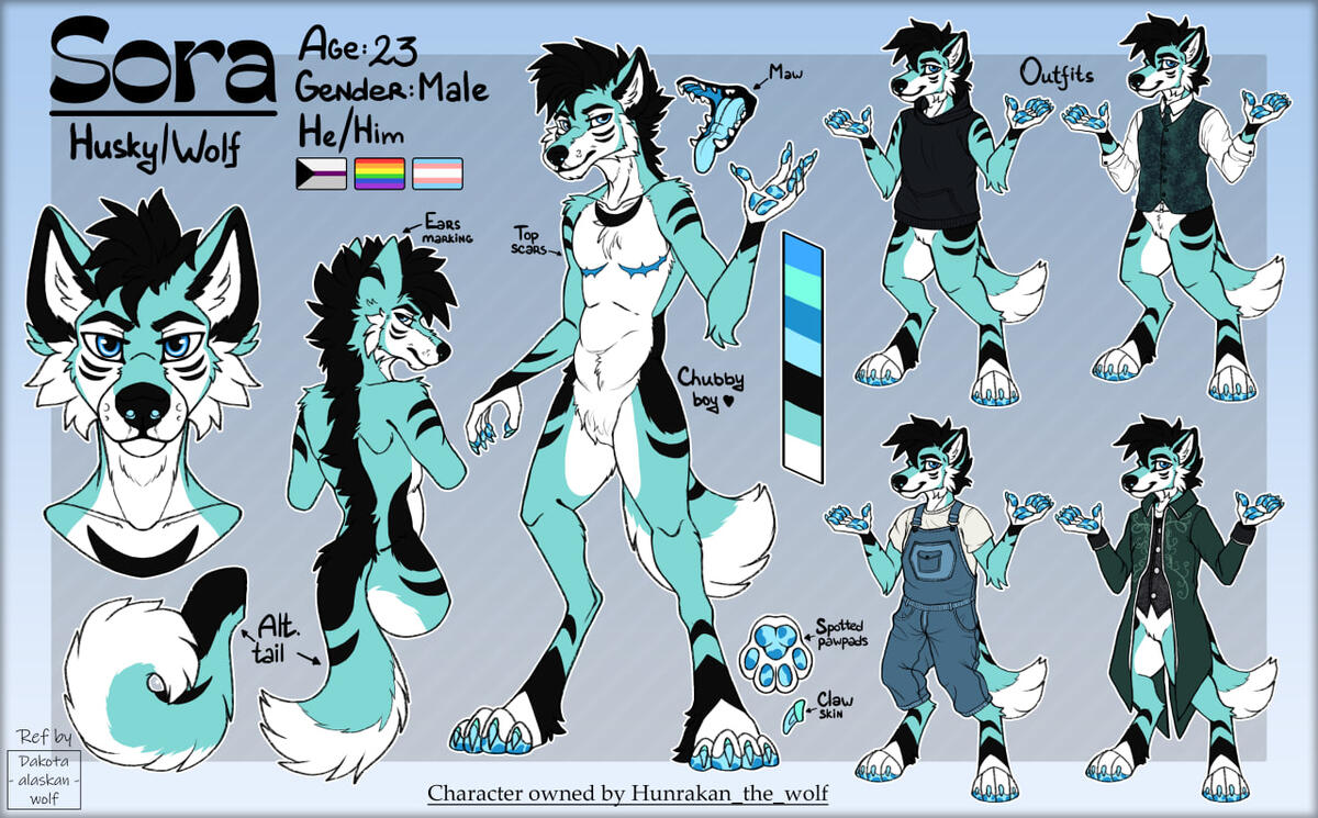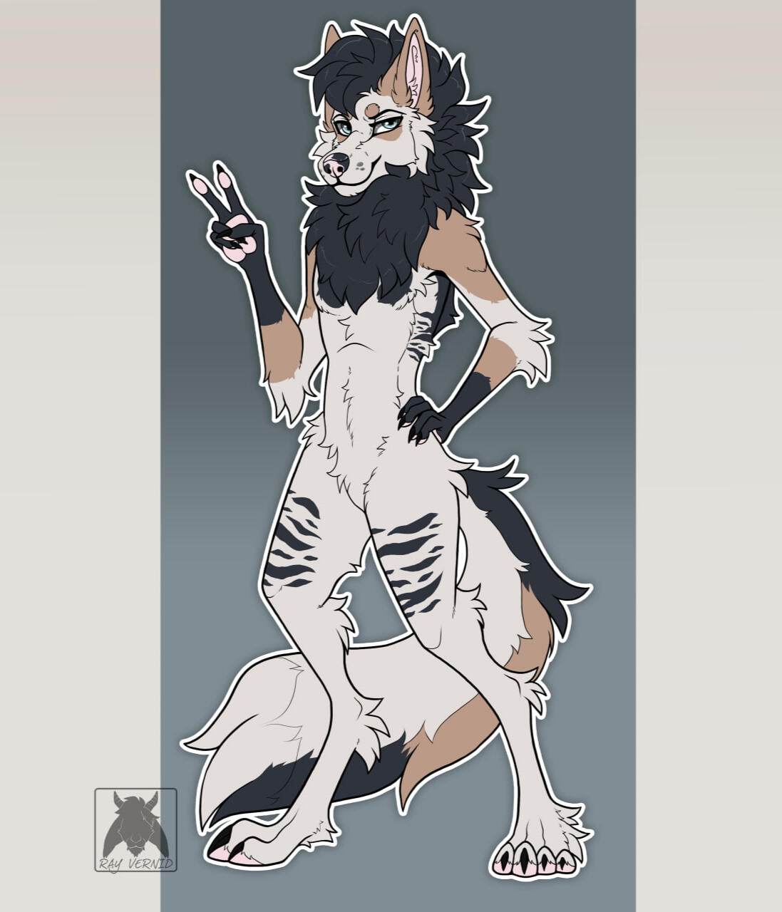 3) Front anthro fullbody + back fullbody, 2 headshots, name/info box, color pallet, mouth + paws close up, 3 items of choice - 200€• Outfits chibi can be added for extra (10€ per one)